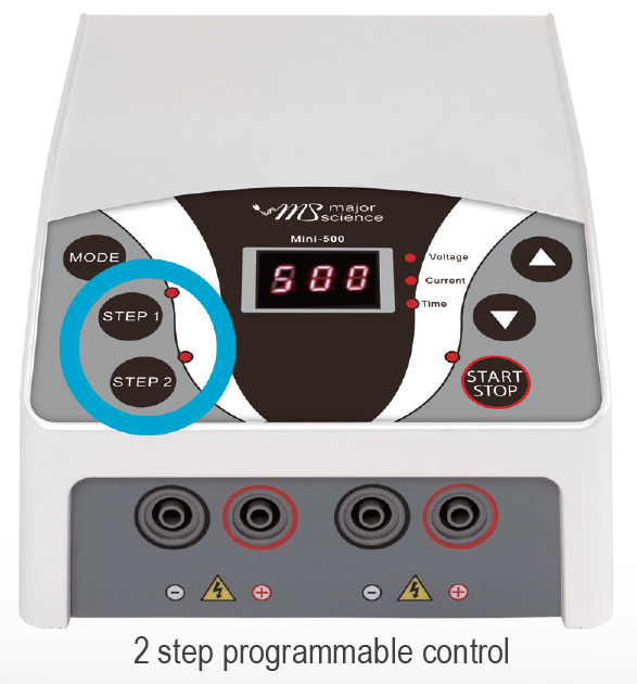 Designed in compact sizing with versatility, the Mini Pro Power Supply is an ideal choice for space and budget saving. Mini Pro 500V comes with maximum 500V and 400mA capacity. It can meet a broad range of applications including horizontal DNA/RNA gels, SDS-PAGE, mutation detection and western blotting. The running parameter provides constant voltage or current in 1V or 1mA. Continuous or timed operation is easily performed using the simple and user-friendly interface. The safety features are also incorporated into the unit including no load detection and shrouded plug and sockets design. The automatic crossover function also ensures your experiment runs smoothly. The Mini Pro 500V comes with 2 terminal outputs so 2 gel tanks could operate simultaneously, saving you time and bench space.